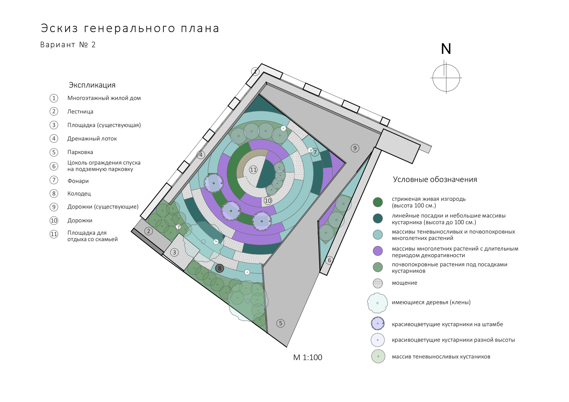 Предложены два варианта композиции, один из которых отличается более мягкими природными формами, а другой содержит строгие симметричные линии посадок.