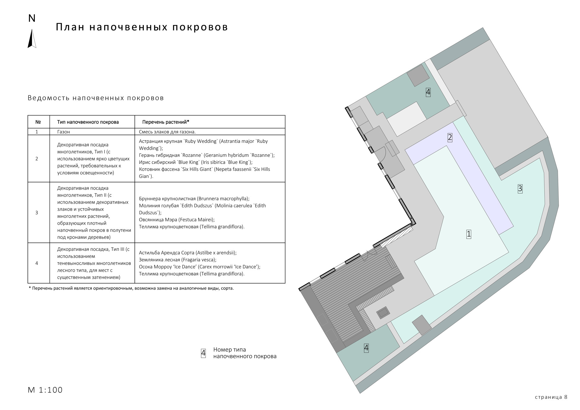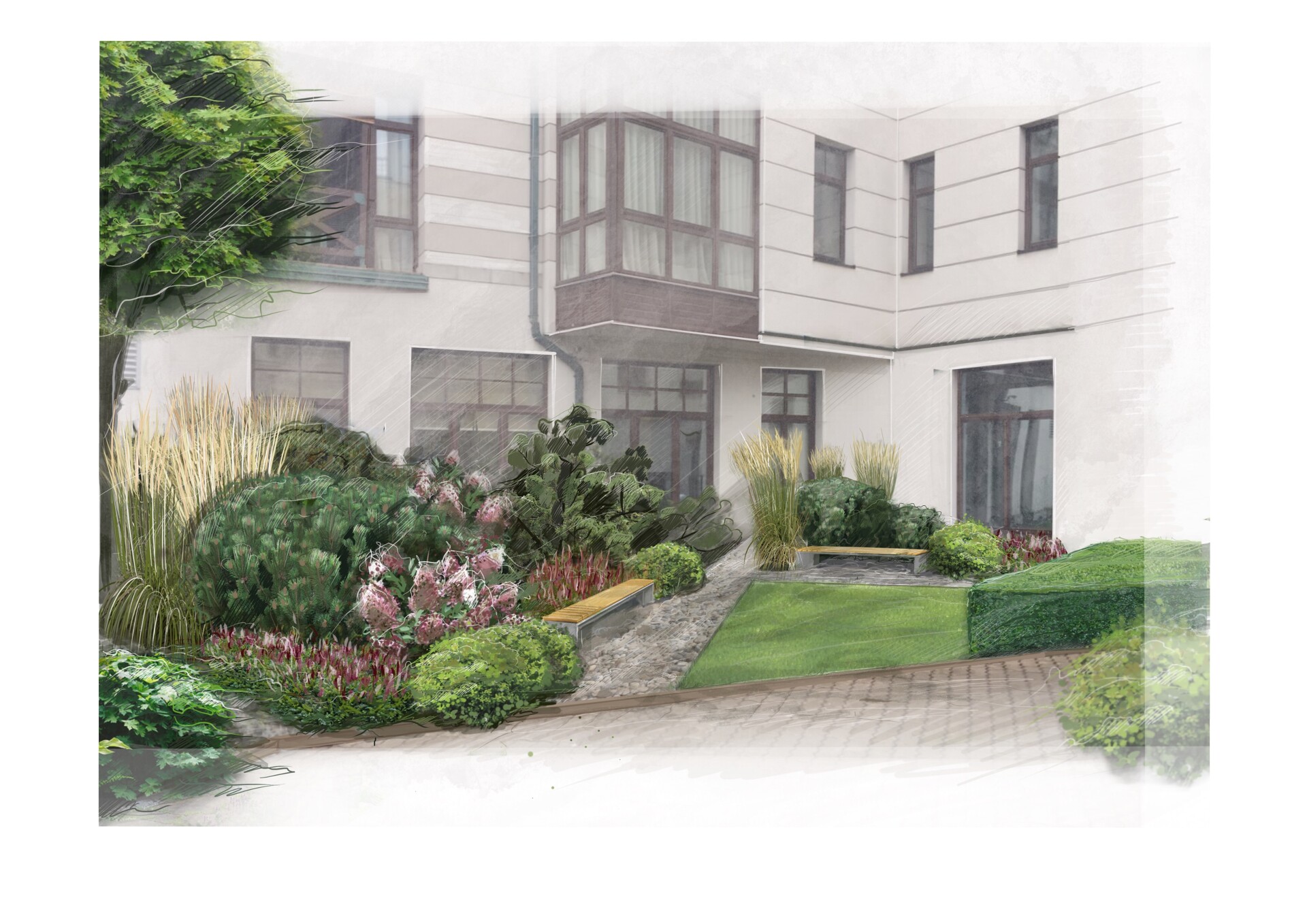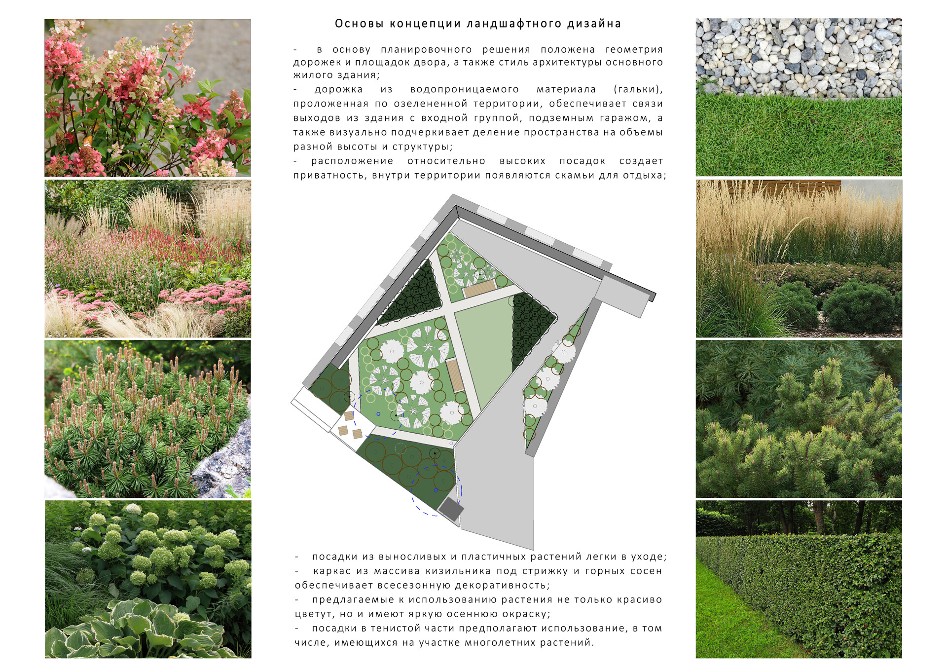 Посадки из пластичных и выносливых растений стабильно декоративны в разные сезоны и легки в уходе. Все высаживаемые кустарники и небольшие деревья имеют компактные корневые системы (безопасны для перекрытий подземного гаража).