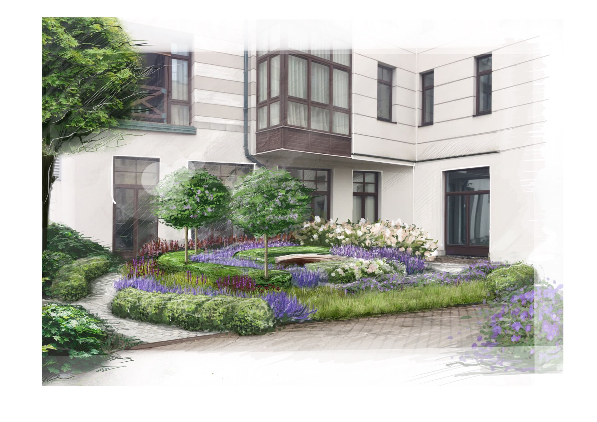 Основой обновленной планировки сада стала строгая геометрия, заданная формами самого двора, мощения и современной архитектурой здания.
