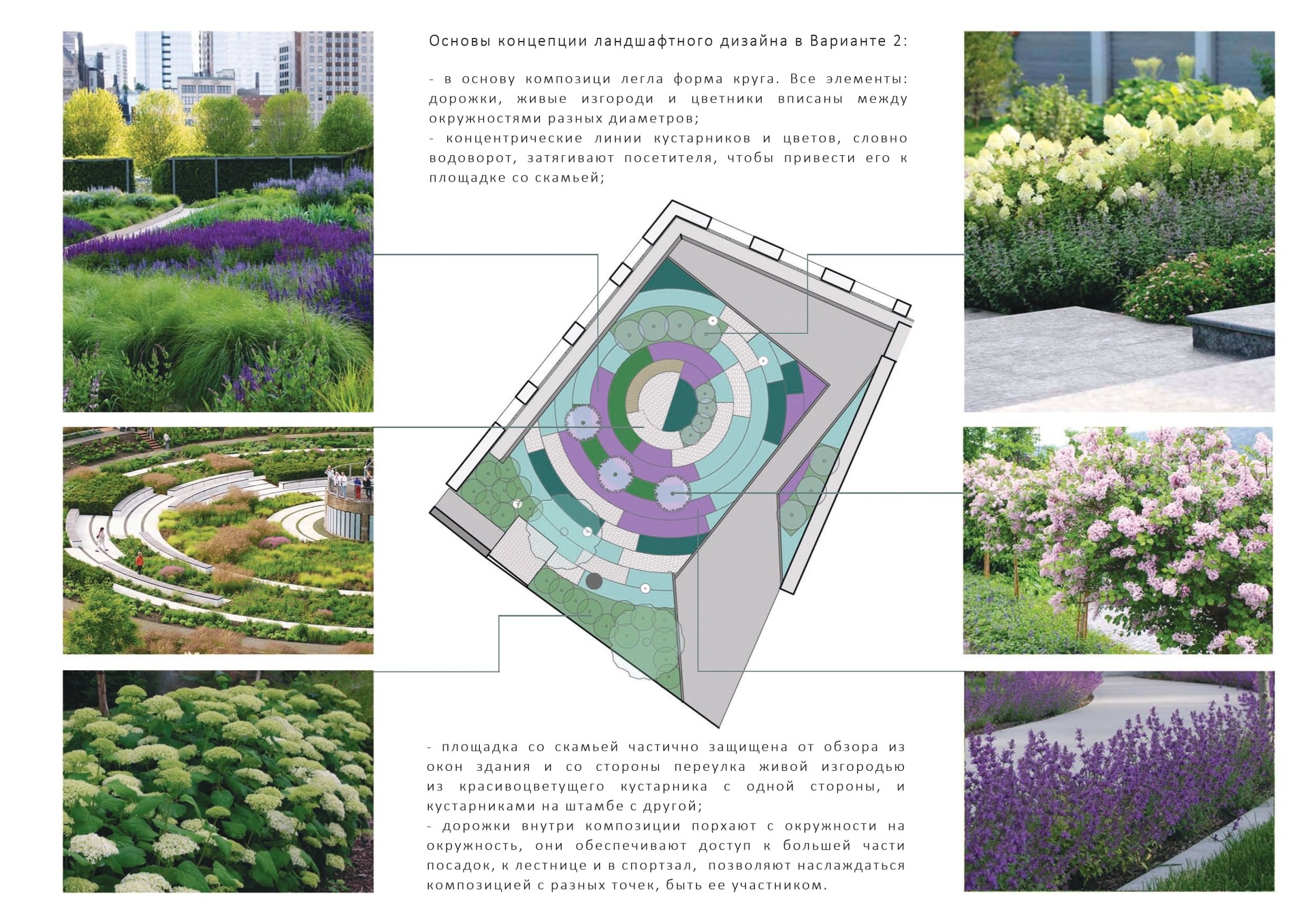 В основу предложенных вариантов планировок обновленного сада легли строгие геометрические формы - под стать современной архитектуре здания.