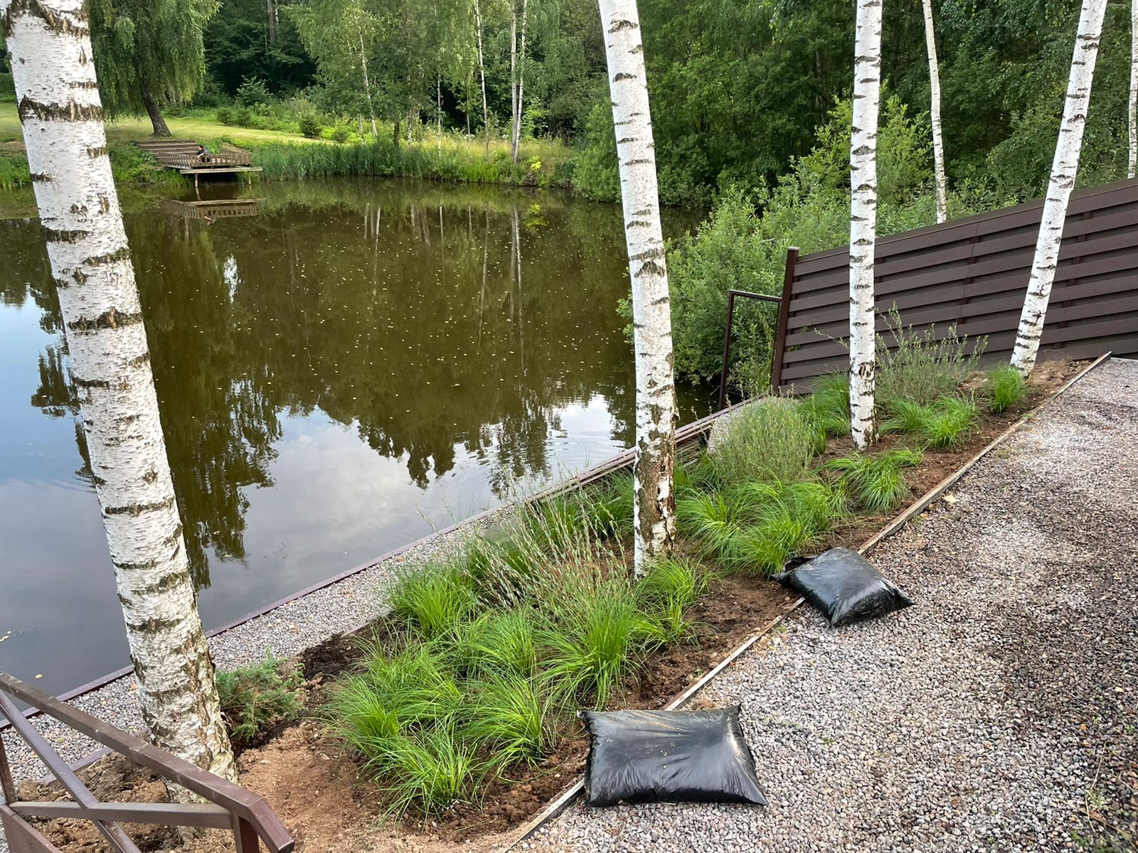 Склон набережной отдан волнующимся на ветру кустовым ивам и осокам. Многоствольные высокие ивы с подлеском из теневыносливых кустарников и многолетников скрывают углы участка на границе с соседями.
